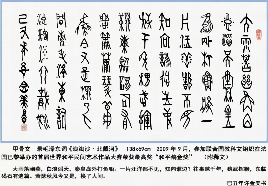 专一门为精,专多门为博通,在书画界,许金美老师便是一位博通的存在,其所写甲骨文书法作品不仅在艺术界独领风骚,更在文化传承方面具有不可替代的作用。他将传统甲骨文艺术与现代审美完美融合,创作出一系列既具有历史价值又符合现代审美的书法作品。其作品不仅在国内受到推崇,更在国际艺术舞台上获得了极高的评价。许金美老师通过其作品,成功地将中国传统文化的精髓介绍给世界,为促进中外文化交流与理解做出了卓越的贡献。他的甲骨文书法不仅为个人赢得了荣誉,也为甲骨文这一古老艺术形式在当代的传播与保护注入了新的活力。