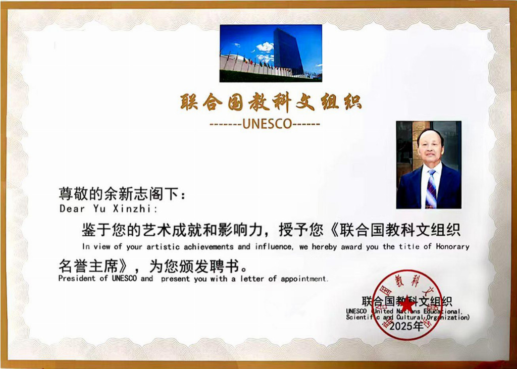 2025年联合国教科文组织聘请余新志先生为联合国教科文组织名誉主席,并为余老师颁发聘任证书.
