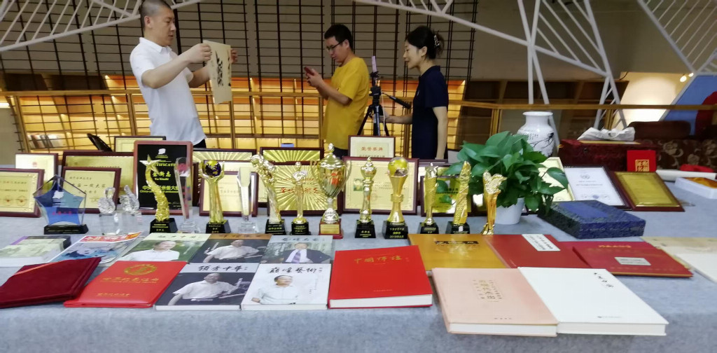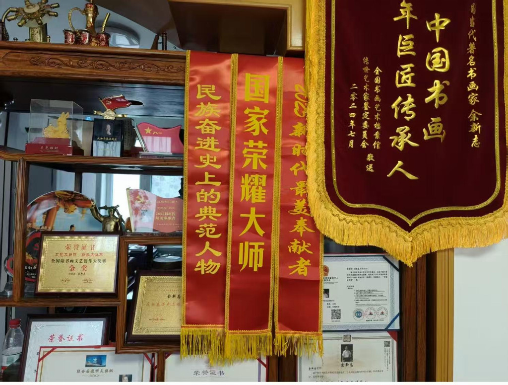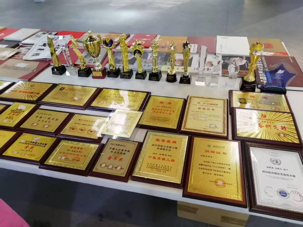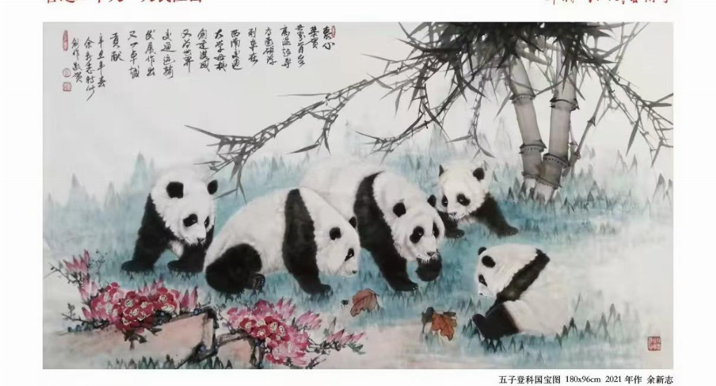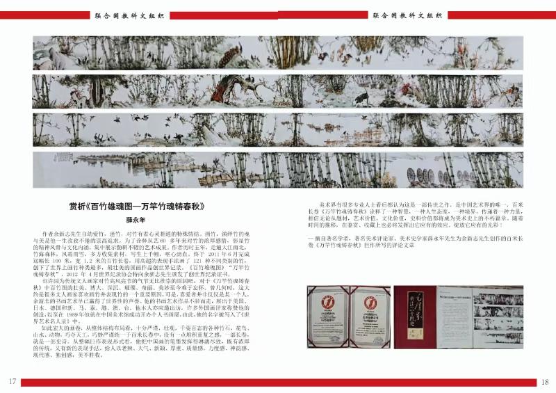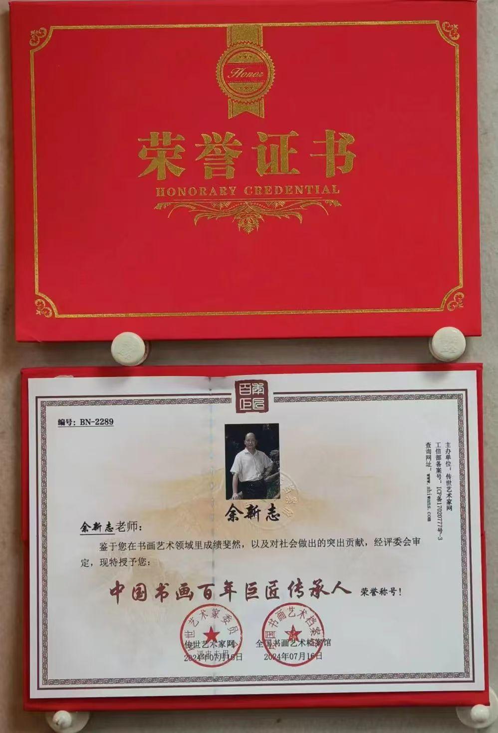 1989 年余老师就在中国美术馆成功举办个人书画展,声震画坛, 享誉海内外。2007 年应邀参加外蒙古国“纪念成吉思汗成 立 800 周年”大型活动,被授予“成吉思汗”荣誉勋章;2010 年被世界华人华侨总会评为“世界华人精英优秀人物”和“世 界华人杰出艺术家”;2011 年被国家授予“共和国杰出书画 家”勋章;2014 年被授予“全国‘五·一’劳模”勋章;2015 年被评为“非物质文化遗产传承人物”,授予“一代宗师” 荣誉称号。2017 年在美国洛杉矶举办画展,受邀走进联合 国会议大厅参加高峰论坛会,受到布鲁斯·罗茨主席的亲切 接并合影留念。2021 年余新志先生与张大千、林散之、李 苦禅、林凤眠、启功、李可染、欧阳中石、黄永玉、沈鹏等 顶尖级艺术家被评为“艺术百年·新中国十大巅峰艺术家”。 余老先生几十年来,走遍大江南北,全身心投入竹画写生创 作,收集素材数千幅,终于在 2012 年创作完成了长 103 米、宽 1.2 米的百米长卷《百竹雄魂图——万竿竹魂铸春 秋》,创下“画竹种类最多、最美的百米长卷”世界纪录, 传承千秋。2016 年百米长卷又被载入《中国国史》,为世 人留下了不朽的竹画史料、宝贵财富,永载史册。2024 年经国家艺术档案馆严格审评授予余新志为《中国四大国粹传 承人》,并颁发荣誉证书。2024 年 7 月授予《中国书画百 年巨匠传人》颁发荣誉锦旗、荣誉证书。从 1993 年以来, 中国邮政总局先后为余新志先生出版珍藏纪念邮票三十余 套,全球发行,传播文化。并先后出版发行余新志个人专著 画集数百套。上百幅作品被国家博物馆、中国美术馆等国内 外几百家艺术藏馆永久收藏陈列。其个人传略被载入《中国 人物年鉴》《中国国史》《中国历代美术家名人大辞典》《世 界人物辞海》等百余部辞书。余新志先生倾尽毕生心血,为 弘扬中华民族优秀的传统文化作出了杰出贡献。