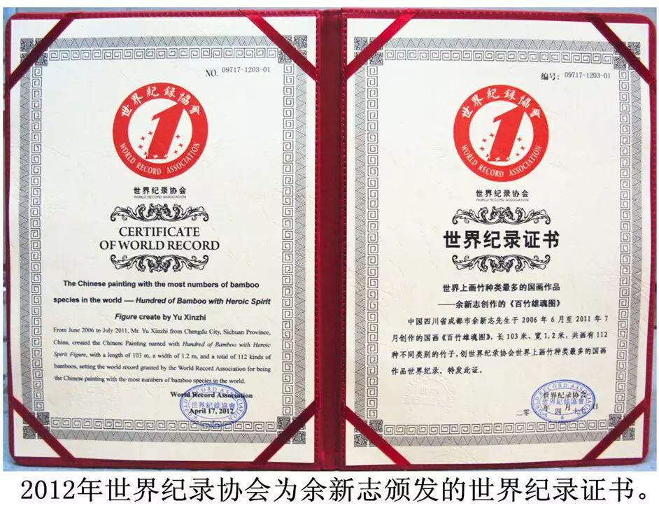 2011年6月,国画大师余新志老师历时5年完成了一幅幅长100米,宽1.2米的百竹长卷,用高超的表现手法画了112种不同类别的竹子,创下了世界上画竹种类最多,最壮美的国画作品创世界记录。《百竹雄魂图》——“万竿竹魂铸春秋”,2012年4月被世界纪录协会向余新志先生颁发了创世界纪录证书。