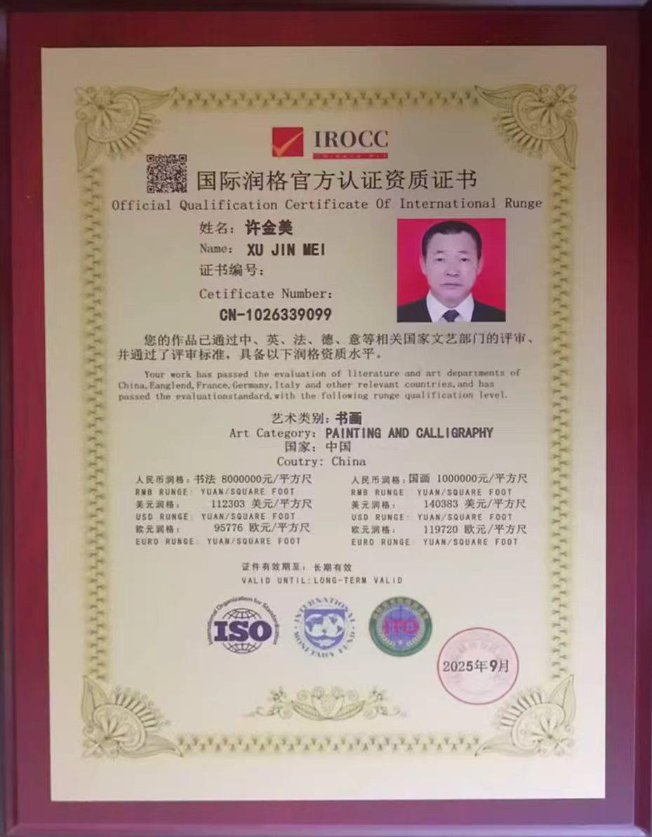 △中国文联书画艺术中心顾问丶中国书协顾问丶中国书法家协会(港注)名誉主席权希军,曾在中国国家画院丶山东曲阜两次参观了许金美参展的近50幅书画作品后,作出了这样的高度评价:“书画多种多样,幅幅精美绝伦”。