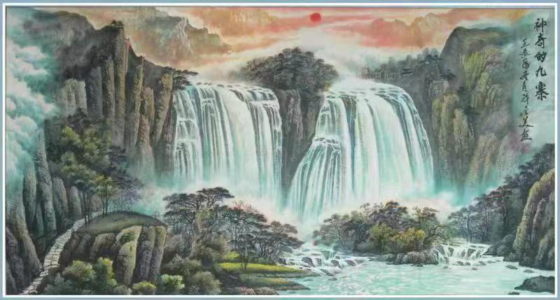 国画:神奇的九寨180cmx97cm(孤品)。刊登在本人出版的巜中美建交37周年》的纪念邮册中。