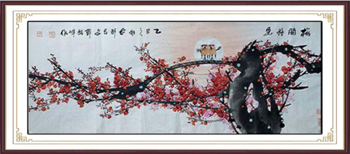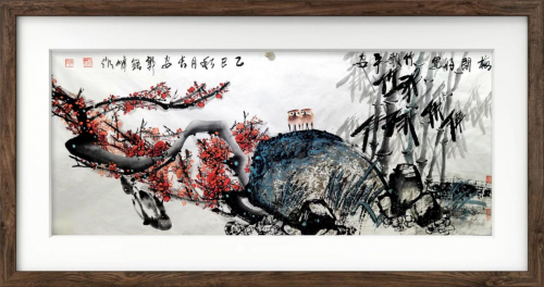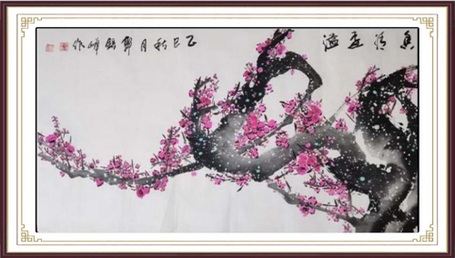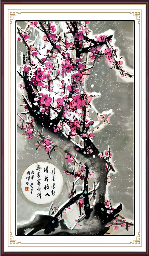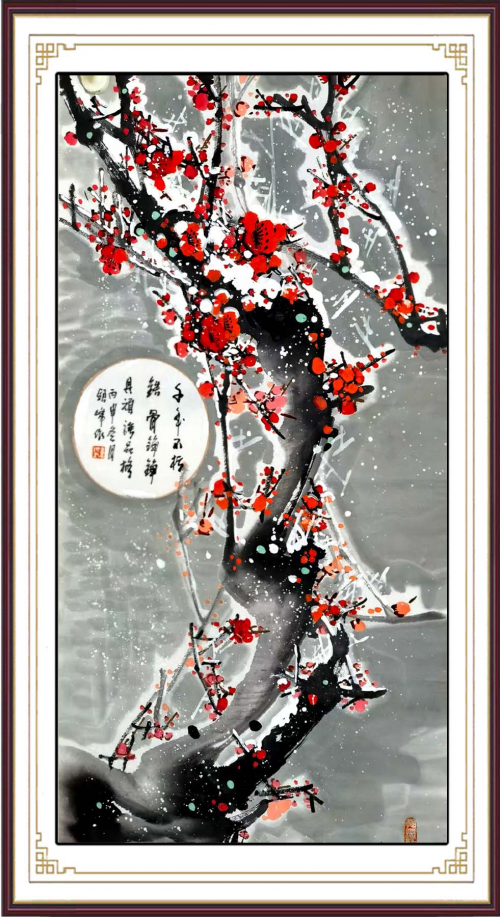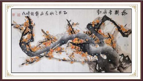 其梅花作品则开创了油画表现传统题材的新境界。他突破传统程式,以奔放的笔触、凝练的构图,赋予梅花全新的视觉张力。画中梅枝如铁,花朵似火,在苍劲与柔美之间达成完美平衡。尤其令人称道的是,他将书法线条的韵律感融入油彩之中,通过色彩的堆叠与流淌,既保持了油画的材质美感,又传达出中国文人画追求的“傲骨凌霜”精神意境。