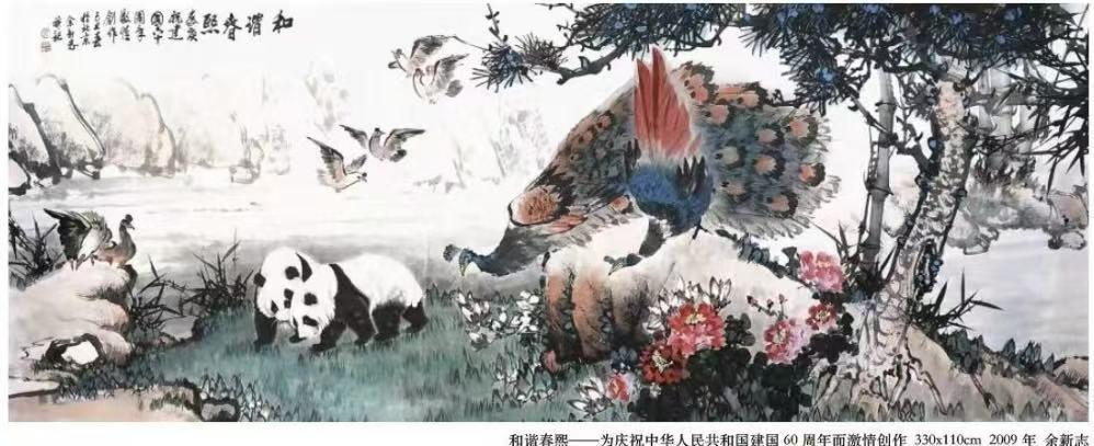 1989 年余老师就在中国美术馆成功举办个人书画展,声震画坛, 享誉海内外。2007 年应邀参加外蒙古国“纪念成吉思汗成 立 800 周年”大型活动,被授予“成吉思汗”荣誉勋章;2010 年被世界华人华侨总会评为“世界华人精英优秀人物”和“世 界华人杰出艺术家”;2011 年被国家授予“共和国杰出书画 家”勋章;2014 年被授予“全国‘五·一’劳模”勋章;2015 年被评为“非物质文化遗产传承人物”,授予“一代宗师” 荣誉称号。2017 年在美国洛杉矶举办画展,受邀走进联合 国会议大厅参加高峰论坛会,受到布鲁斯·罗茨主席的亲切 接并合影留念。2021 年余新志先生与张大千、林散之、李 苦禅、林凤眠、启功、李可染、欧阳中石、黄永玉、沈鹏等 顶尖级艺术家被评为“艺术百年·新中国十大巅峰艺术家”。 余老先生几十年来,走遍大江南北,全身心投入竹画写生创 作,收集素材数千幅,终于在 2012 年创作完成了长 103 米、宽 1.2 米的百米长卷《百竹雄魂图——万竿竹魂铸春 秋》,创下“画竹种类最多、最美的百米长卷”世界纪录, 传承千秋。2016 年百米长卷又被载入《中国国史》,为世 人留下了不朽的竹画史料、宝贵财富,永载史册。2024 年经国家艺术档案馆严格审评授予余新志为《中国四大国粹传 承人》,并颁发荣誉证书。2024 年 7 月授予《中国书画百 年巨匠传人》颁发荣誉锦旗、荣誉证书。从 1993 年以来, 中国邮政总局先后为余新志先生出版珍藏纪念邮票三十余 套,全球发行,传播文化。并先后出版发行余新志个人专著 画集数百套。上百幅作品被国家博物馆、中国美术馆等国内 外几百家艺术藏馆永久收藏陈列。其个人传略被载入《中国 人物年鉴》《中国国史》《中国历代美术家名人大辞典》《世 界人物辞海》等百余部辞书。余新志先生倾尽毕生心血,为 弘扬中华民族优秀的传统文化作出了杰出贡献。
