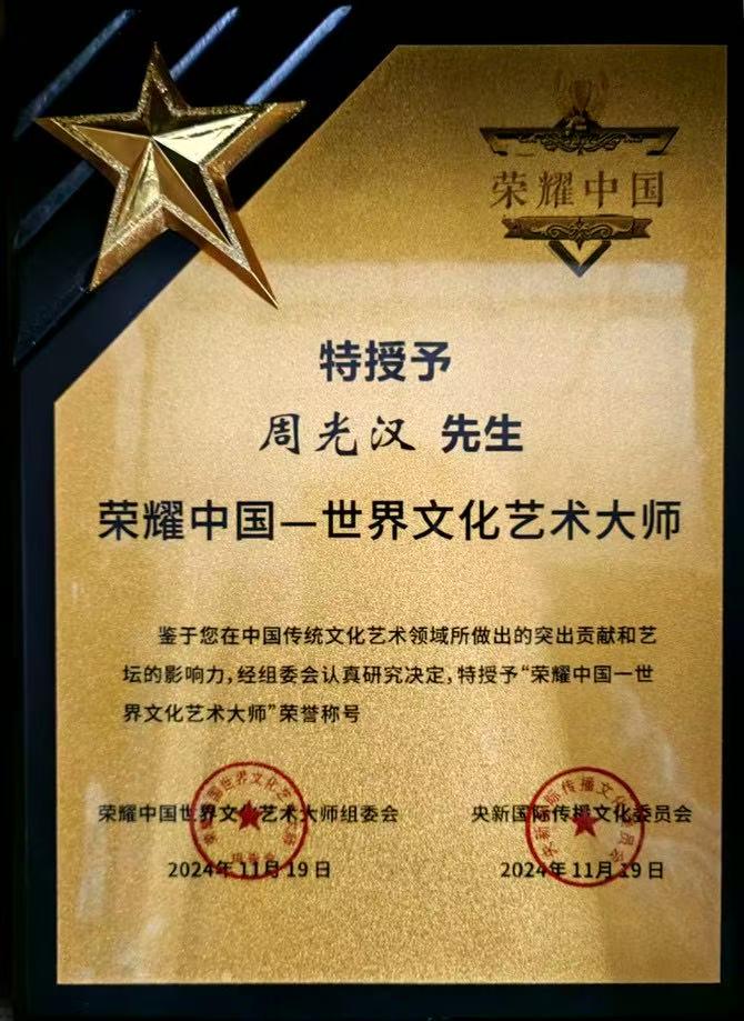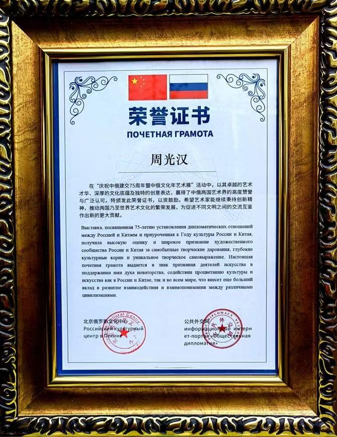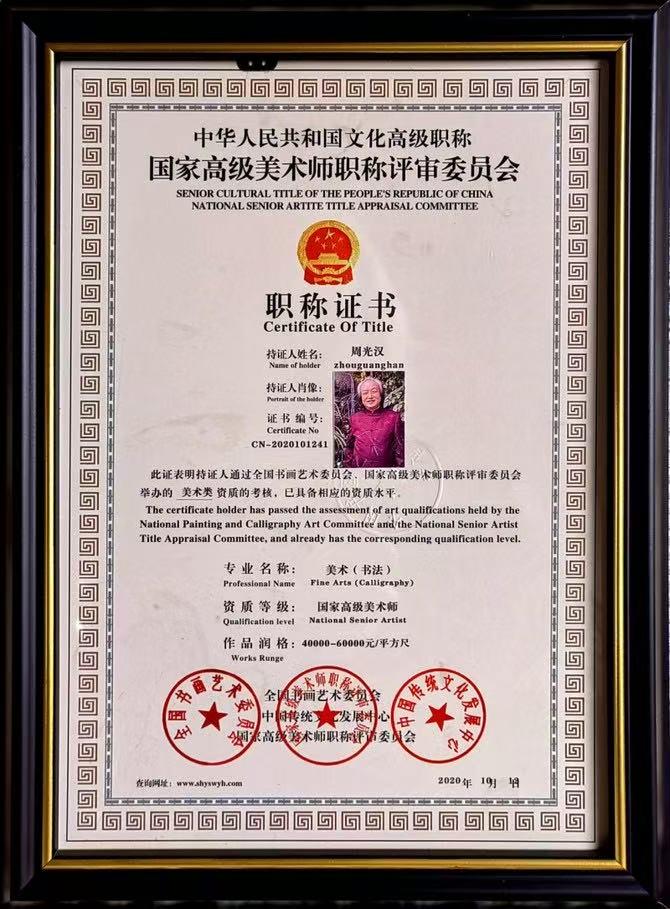 周光汉老师的作品、个人简介入编《跨世纪著名画家经典》、《全国著名画家作品选》、《中国书画藏典》、《全国著名书画家邀请作品展集》、《中国当代美术家光盘》、《中国丹青画卷》、《四川画家小传》丛书。马来西亚出版《周光汉国画艺术选》;世界知识画报专版推荐,并授予“世界华人杰出艺术家”:人民日报在文艺版刊登作品及专文介绍,并授予“中国艺苑名家"称号,同时出版中国实力派名家名作《周光汉国画集》,2005年16幅作品入选国家集邮总公司全国发行的“当代中华文化名家专题邮票工程”;中国画报、人民画报、经济日报、世界知识画报、国际商报、燎望周刊等报刊将本人作品及艺术成就登图撰文重点推荐。4幅红梅图,分别被美国伊鲁大学、中国驻联合国代表团、中国驻美国大使馆、纽约领事馆收藏:美国侨报、新华社等6家国际性报刊同时报道,评价极高;在促进海峡两岸和平统一书画交流中成绩显著,并荣获“千年和平金奖”。