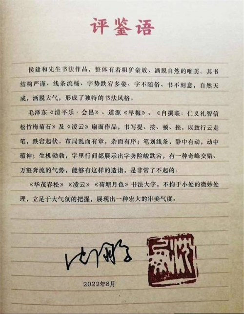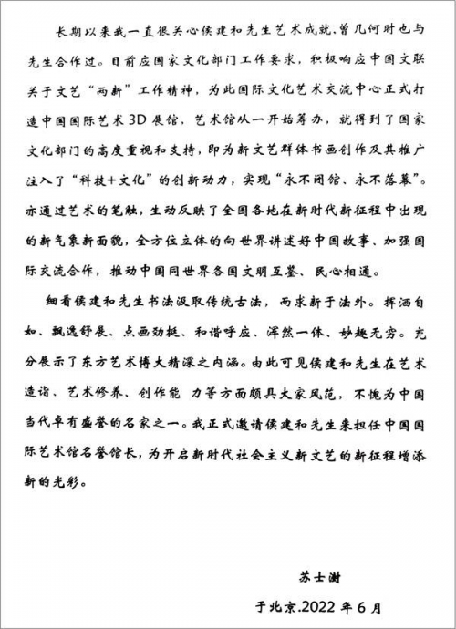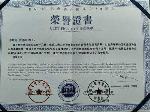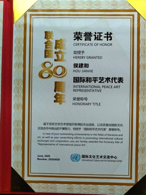 侯建和,笔名山人,1952年6月出生于江苏连云港,在江苏淮安工作退休。自幼爱好书法艺术,多年来为传承弘杨中华传统文化鼓与呼。入选国家文化名家暨“四个一批”人才工程;获颁特殊津贴证书;2020年国务院颁发《人民艺术家》证书。兼任国家文旅部名誉顾问;外事工作委员会办公室大国外交文艺使者、中国文化艺术国际代表;国台海峡论坛文化顾问;故宫文化创意发展研究中心艺术专家顾问;全球文明交流互鉴合作研究理事会理事;中国乡土艺术协会顾问;中国国际教育电视台艺术顾问;中国国际艺术馆名誉馆长;中书协理事;法兰西皇家画院终身院士;联合国科教文组织国际金牌艺术家、艺术博士;中国国际文艺家协会常务理事;巴黎艺术中心、央视书画频道、香港电视台签约、特聘艺术家;中国艺术研究院国家文化发展战略高级研究员;高级书画鉴赏师;全球青少年书画艺术大会书画导师等。1998年参加“98韩国世界美术大展”;2018年参加纽约时代广场“中国艺术大家形象展播工程”、中法建交54周年“法国邮票上的中国艺术名家”活动;2019年参加中法建交55周年“巴黎卢浮宫艺术展”;2019年获人民日报“全国重点推荐艺术名家”,并在互联网宣传报道等。1999年中国文联授予“海峡两岸德艺双馨艺术家称号”;2015年国家文化部授予“中国当代书画艺术名家”称号;并颁发《华人艺术大师》证书;2020年国务院授予“人民艺术家”证书;2021年央媒联盟授予“全国十佳杰出功勋艺术家”证书。2022年入选央视重点推荐新时代艺术领袖网络宣传活动,并入编央视《新时代人民艺术家典藏》;2022年入编国际航空运输协会《中国之声》世航专刊、入编国务院新闻办公室编辑出版的“中国艺术白皮书《侯建和篇》”、入编《中国艺术国际贸易指南》大典并荣获“国家重点推荐——走进世界艺术舞台的国艺巨匠”证书;2022年中共二十大传统文化组委会、人民日报社、中美协、中书协等授予“艺术界时代楷模”证书;2023年国际文化艺术交流高峰论坛组委会颁发《中外文化交流杰出人物》证书;入编国家《复兴文库(人艺篇——侯建和卷)》;入编国家首部爱国主义教育学刊《中国红》;2023年国家外事工作委员会办公室授予“大国外交文艺使者”,“中国文化国际代表”;入编由东盟文化信息委员会等及十余个国家参与编辑的《大美之艺》画册并授予“东盟文化艺术交流大使”。2024年国际奥委会授予“东方艺术大师”称号;对外联络部颁发“外联杰出贡献专家”证书;爱国主义教育学刊编辑委员会授予“建国75周年盛世文化奠基人”荣誉称号;中国关工委美育中国文体嘉年华总展演活动中荣获金奖。2025年迎春杯全国优秀艺术作品评选组委会授予“最具收藏价值奖”;入编首次以国家冠名的《中华人民共和国一代宗师》画册;和铁凝、范迪安、孙晓云合编《兰亭与美史》画册;中国互联网新闻中心等授予“中国当代艺术奖金奖”;联合国教科文组织授予“世界艺术终身成就奖”等。