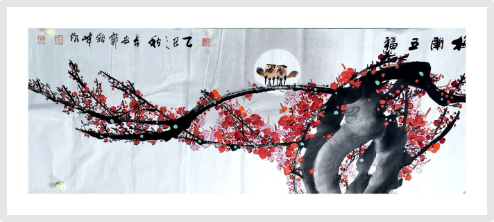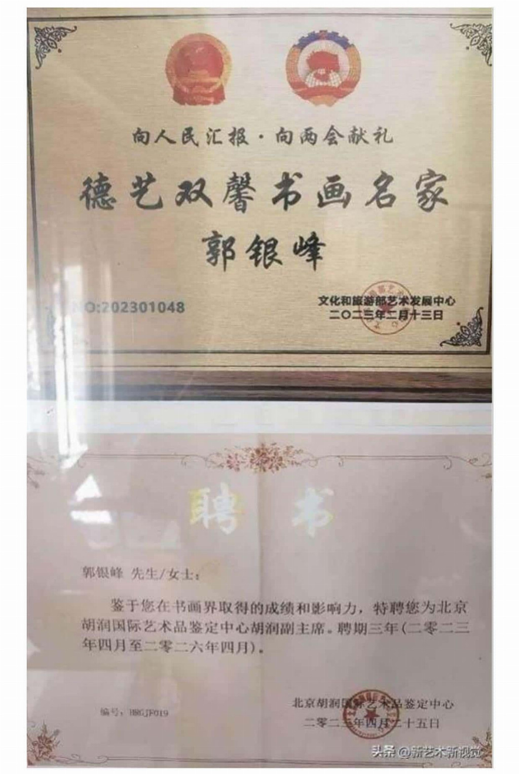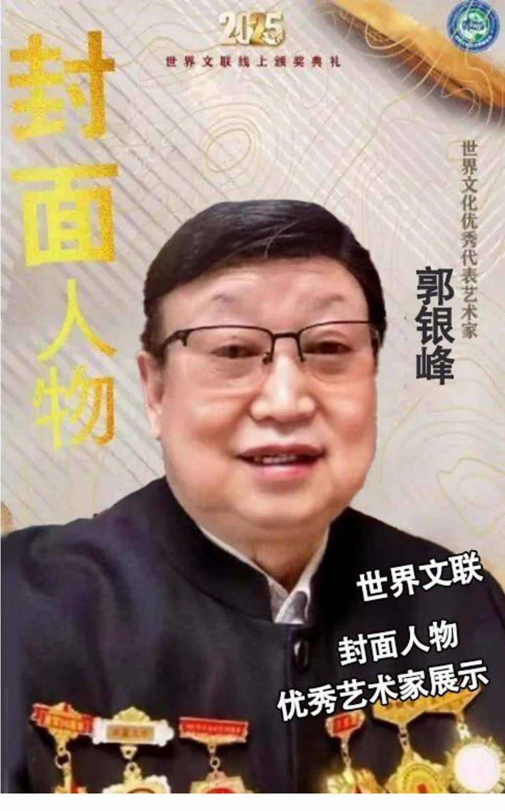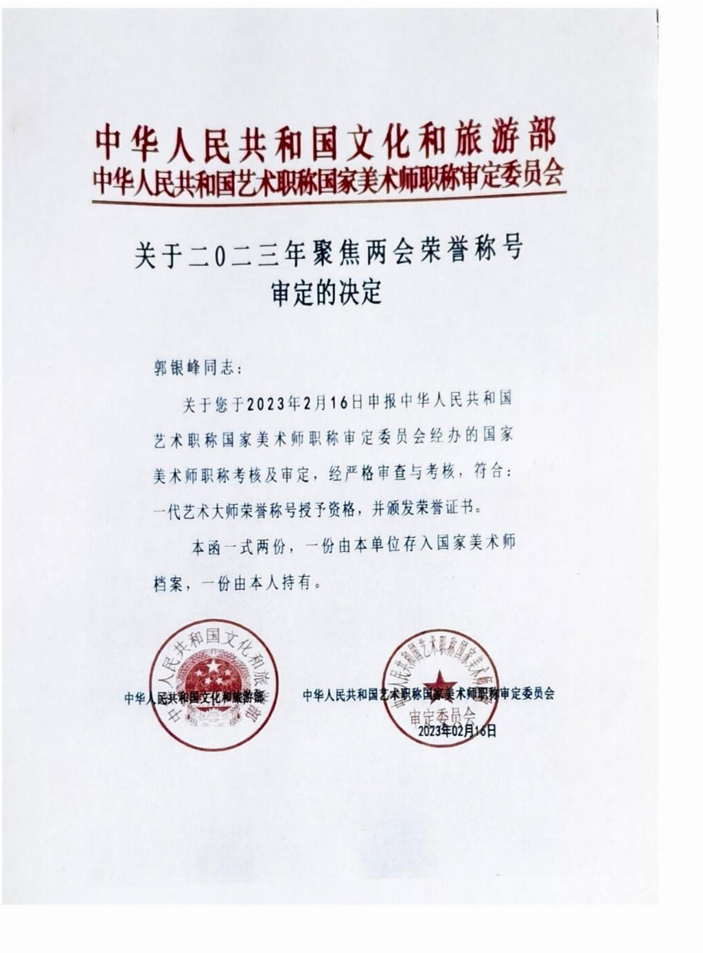郭银峰,1949 年生于甘肃庆阳。1968 年参军,先后在西藏军区、成都军区、解放军西安第二炮兵工程学院、解放军西安政治学院工作,正团职,上校军衔。1994 年转业后供职于陕西省人大办公厅,任厅级巡视员。郭银峰作品油画《放学以后》获 1988 年全国书画展一等奖。国画《黄河颂歌》获 2002 年韩国国际书画大赛最高奖“国际功勋奖”。国画《梅花寒香图》2009 年获全国国画展一等奖。国画《我的同学》获 2010 年全国第十四届大地之歌书画展一等奖。2011 年,郭银峰在北京人民大会堂举办个人书画展及高层艺术研讨书画作品展。2012 年,郭银峰在法国卢浮宫举办书画展,受到国际友人高度评价。现为亚洲书画家协会副主席,胡润国际书画艺术鉴定中心副主席,全国书画艺术委员会副主席,中央美院客座教授,中国国家高级美术师,国家特级书法师,西北书画研究院院长,英国牛津艺术学院客座教授博士生导师,陕西省人民政府参事室文史馆研究员,亚洲博鳌艺术中心研究员。2021 年分别被授予“祖国优秀艺术家”“书画艺术楷模”建党一百年被授予“德艺双馨人民艺术家”荣誉称号,“世界文化艺术形象大师”“中国国家艺术形象代表人物”“中国功勋人物”“一代艺术大师”等荣誉称号。2022 年被特邀成为沈鹏书法艺术工作室专家组高级理事。重点推荐为“中国艺术大家”“人民书画家”“华夏儿女优秀艺术传承之星”“党旗下的艺术大家”称号。授予郭银峰“2023 年度全球十大杰出风云”,“中国艺坛 2023年度优秀艺术家”,“威尼斯双年展——特别推荐艺术家”,文化和旅游部授予“优秀书画导师”,“中国当代世界级艺术家”,“一带一路文化形象大使”“中国国礼特供艺术家”。