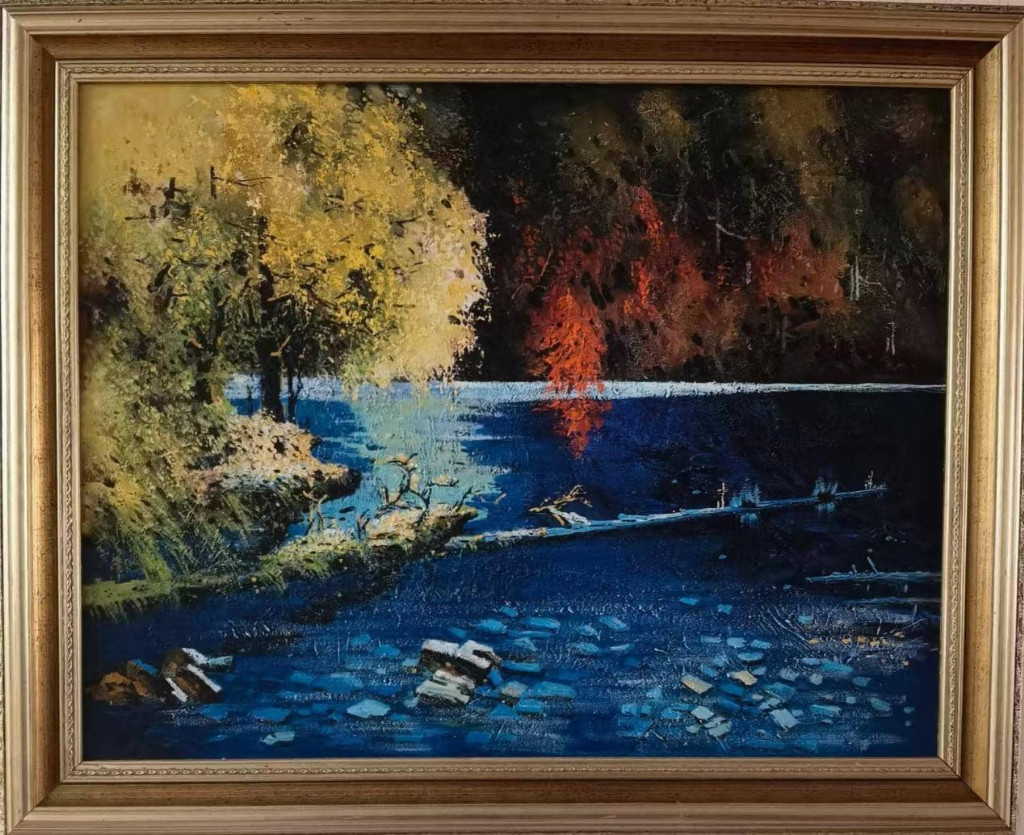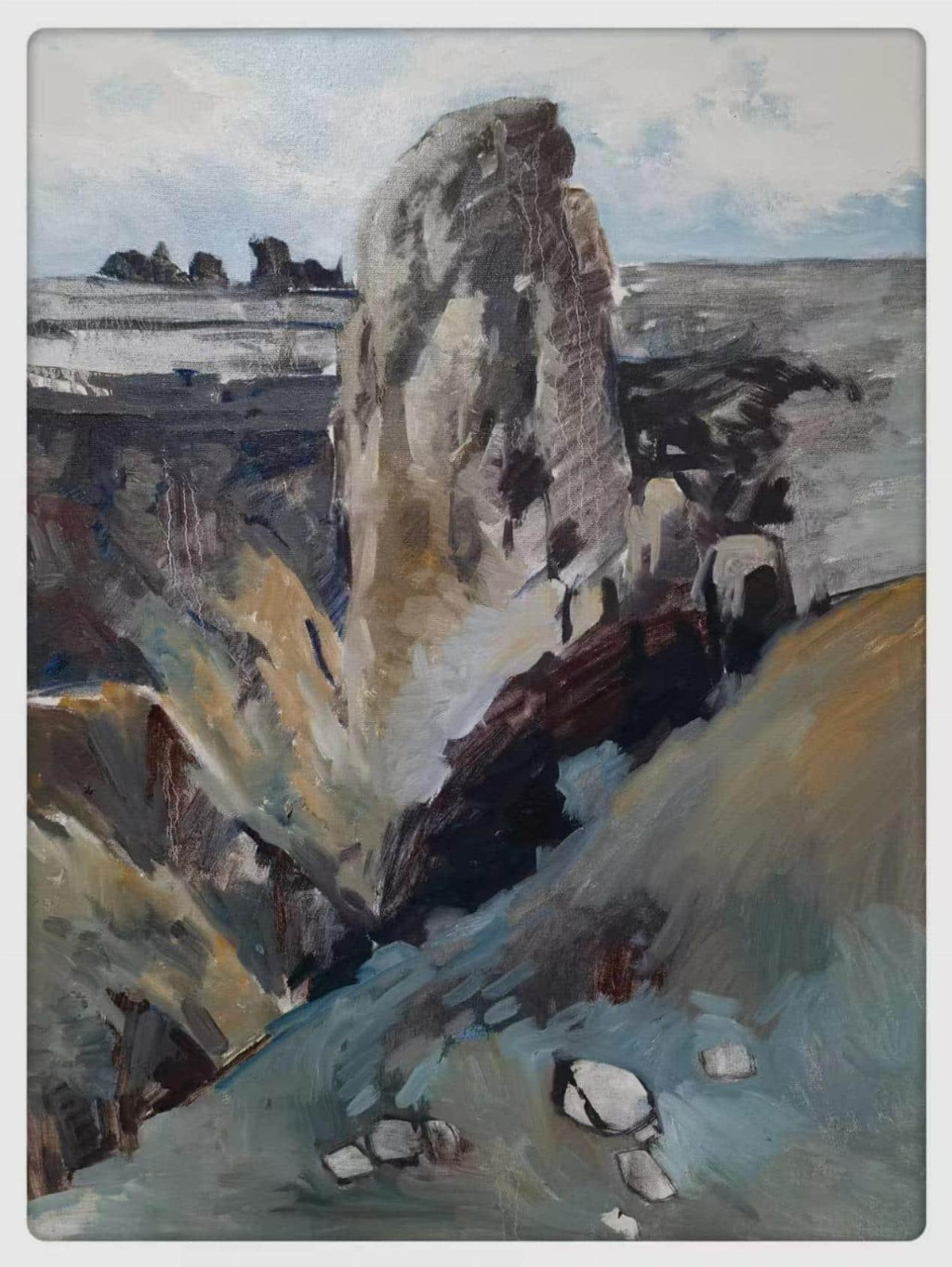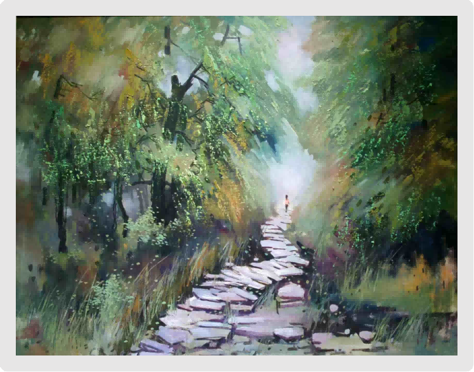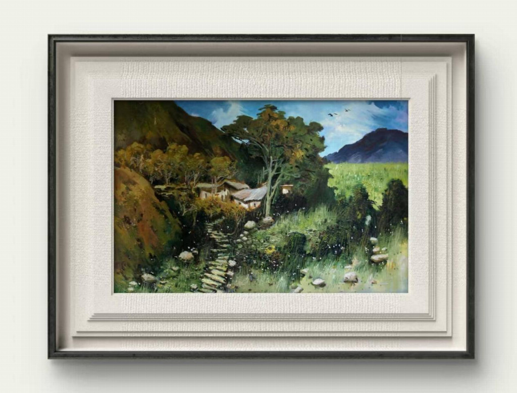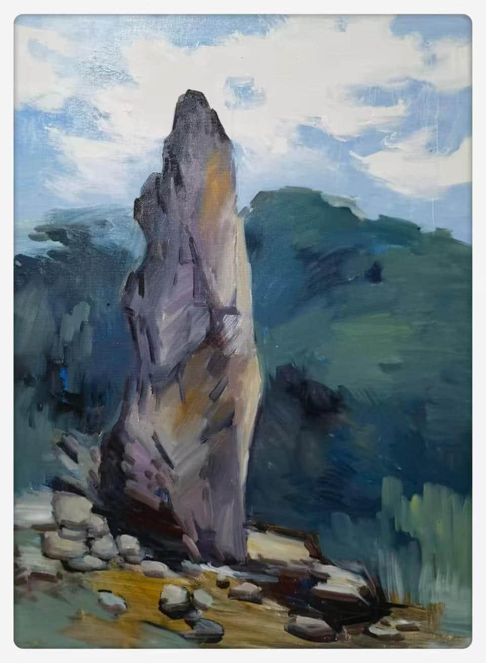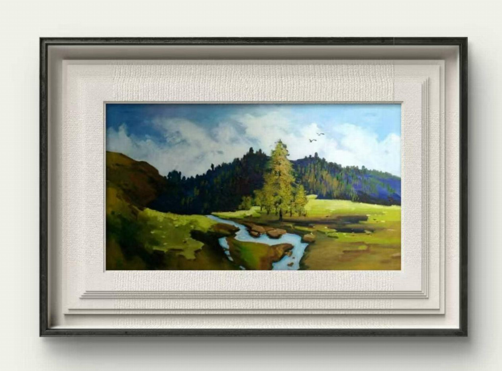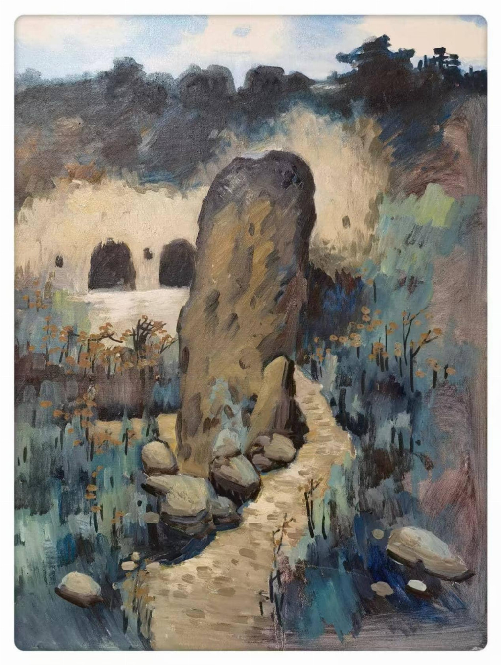 郭银峰先生的油画最引人入胜之处,在于他成功地将中国画的“写意精神”灌注于西方油画的载体之中。他并未拘泥于西方古典油画的严谨透视与细腻描摹,而是大胆地汲取了中国传统书画的养分。在他的笔下,油彩拥有了水墨般的淋漓与气韵;画面的构图,讲究“疏可走马,密不透风”的节奏感;色彩的铺陈,则追求“随类赋彩”而又“气韵生动”的东方美学境界。
