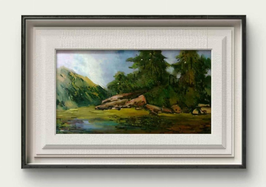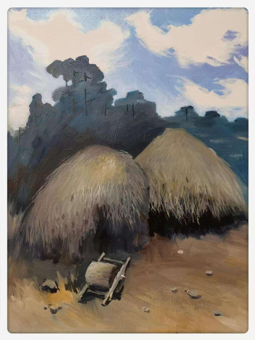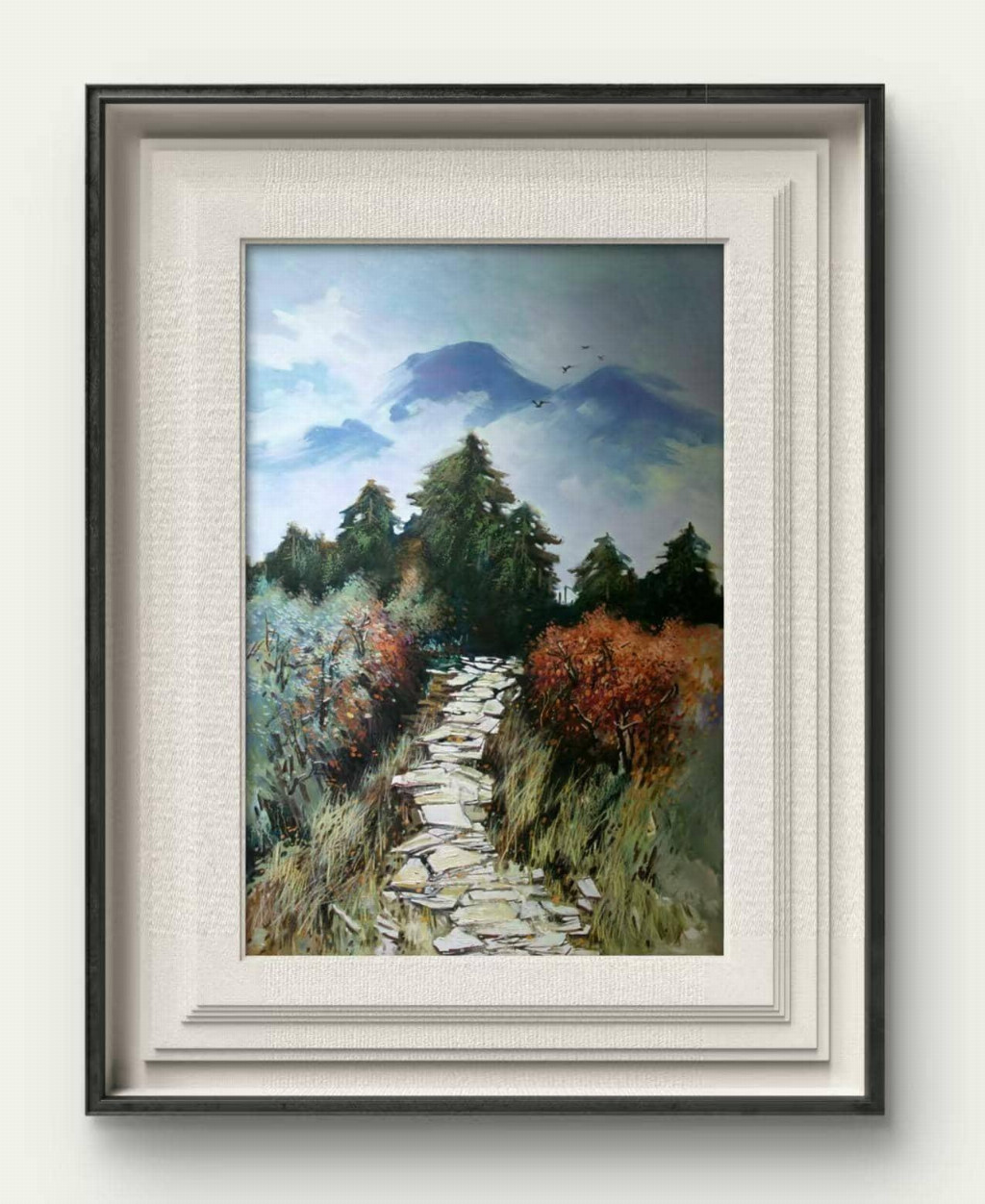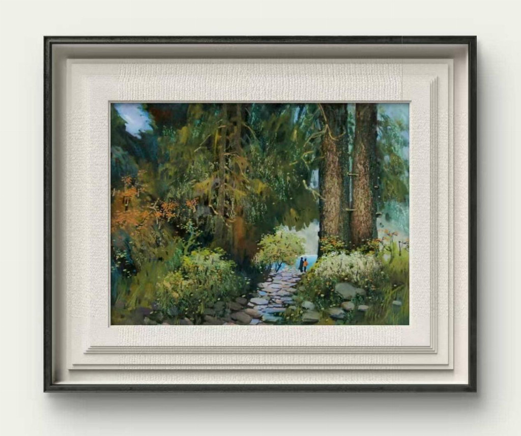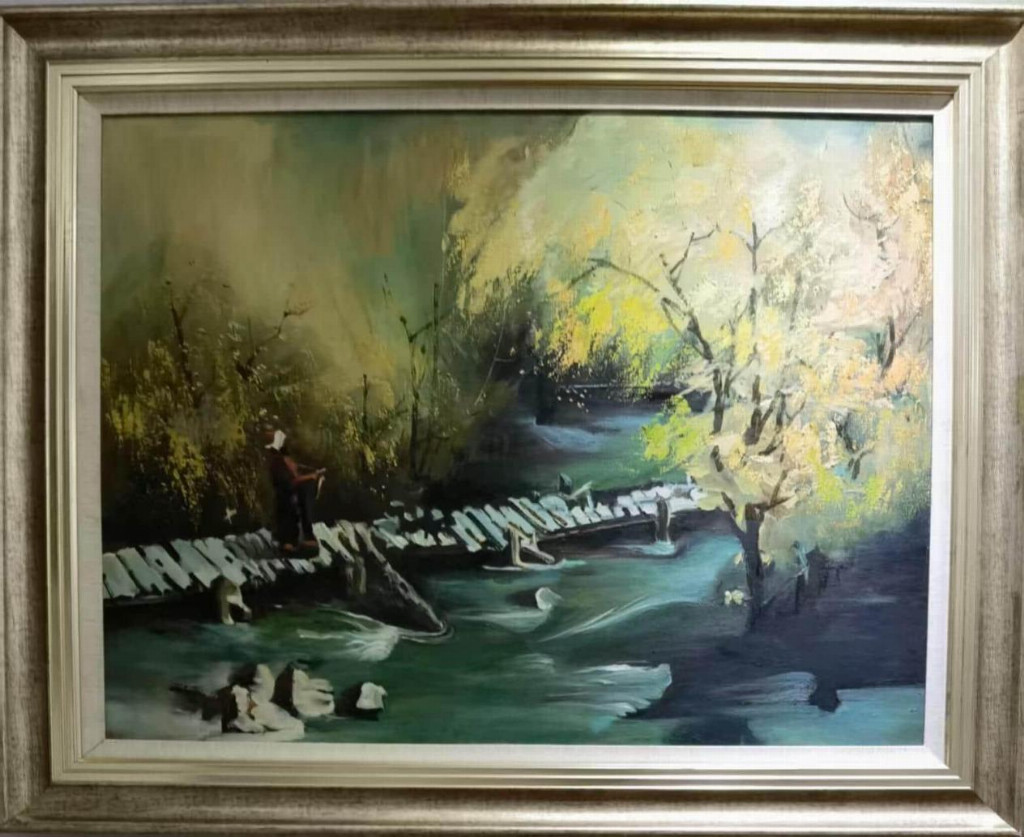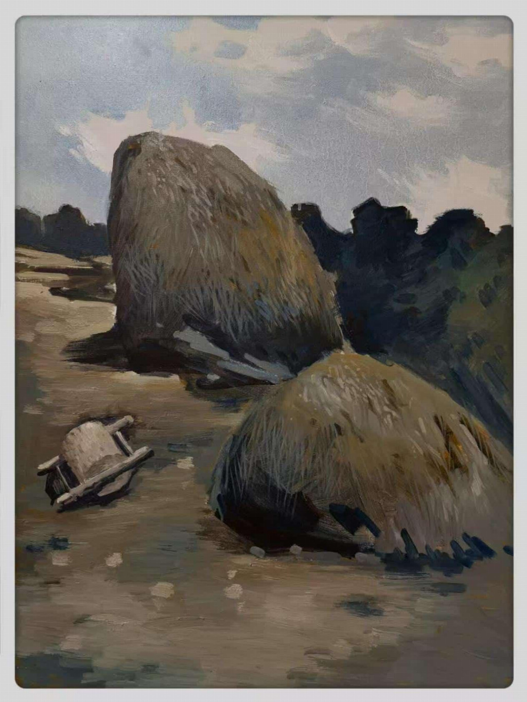 郭银峰先生的油画最引人入胜之处,在于他成功地将中国画的“写意精神”灌注于西方油画的载体之中。他并未拘泥于西方古典油画的严谨透视与细腻描摹,而是大胆地汲取了中国传统书画的养分。在他的笔下,油彩拥有了水墨般的淋漓与气韵;画面的构图,讲究“疏可走马,密不透风”的节奏感;色彩的铺陈,则追求“随类赋彩”而又“气韵生动”的东方美学境界。
