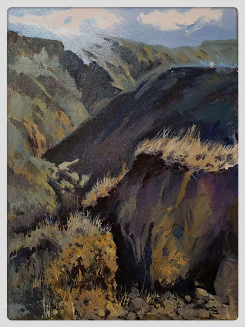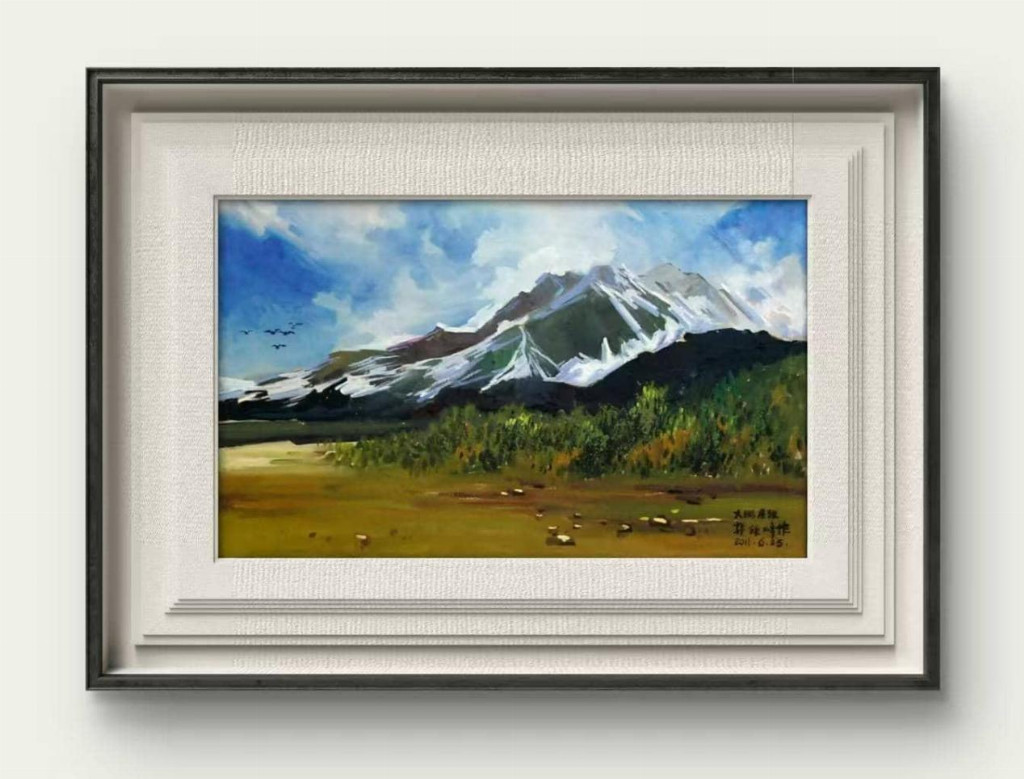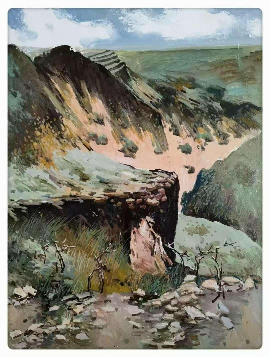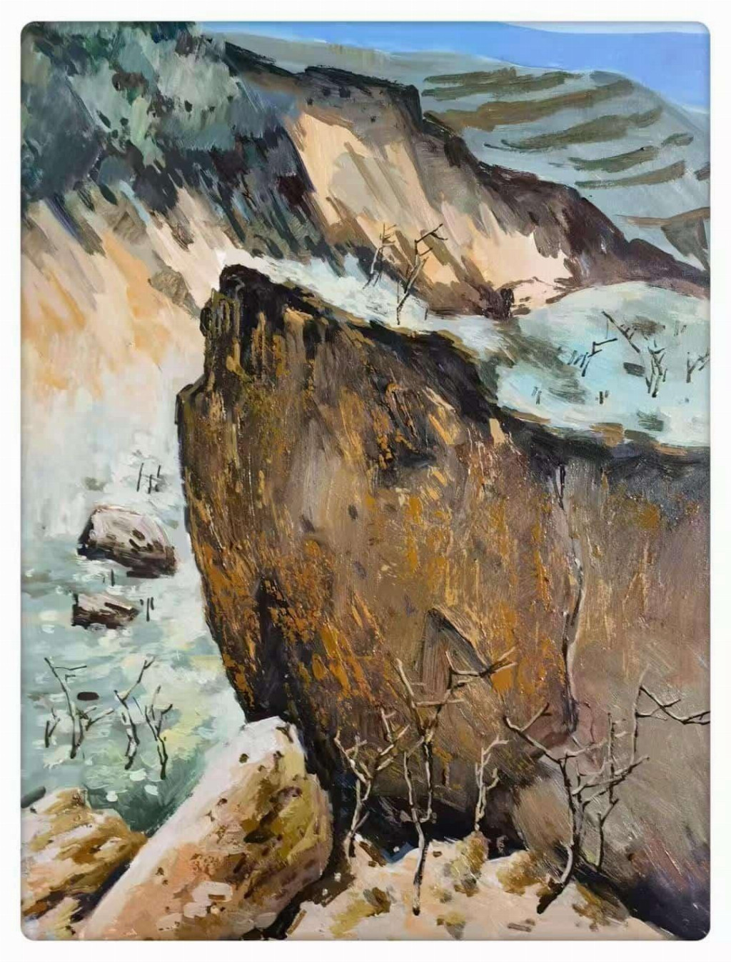 看他的风景油画,无论是《黄土高原系列》还是《江南水乡组画》,我们都能感受到一种超越物象的“意境”。他运用刮刀、画笔等多种工具,创造出兼具肌理感与流动性的独特笔触,使巍峨的山峦具有了书法般的骨力,让静谧的流水蕴含着诗意般的空灵。这种“油彩中国画”的探索,不是简单的技术嫁接,而是文化血脉在新时代艺术形式下的自觉流淌与升华。