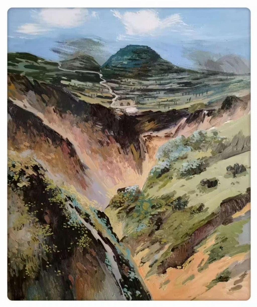 在他的画布上,黄土高坡不再是单调的土黄色,而是被赋予了极其丰富的情感色彩:晨曦中,它是温暖而充满希望的玫瑰金;正午时,它是饱经沧桑、厚重沉着的赭石与熟褐;夕阳下,它又化身为燃烧着生命激情的炽热朱红。他笔下的高原沟壑,刀劈斧凿般的笔触塑造出大地坚韧的肌理,仿佛一位位饱经风霜的老者,默默诉说着千年的故事。这些作品,充满了对民族根基的眷恋与敬畏,是对生生不息的华夏生命力的崇高礼赞。