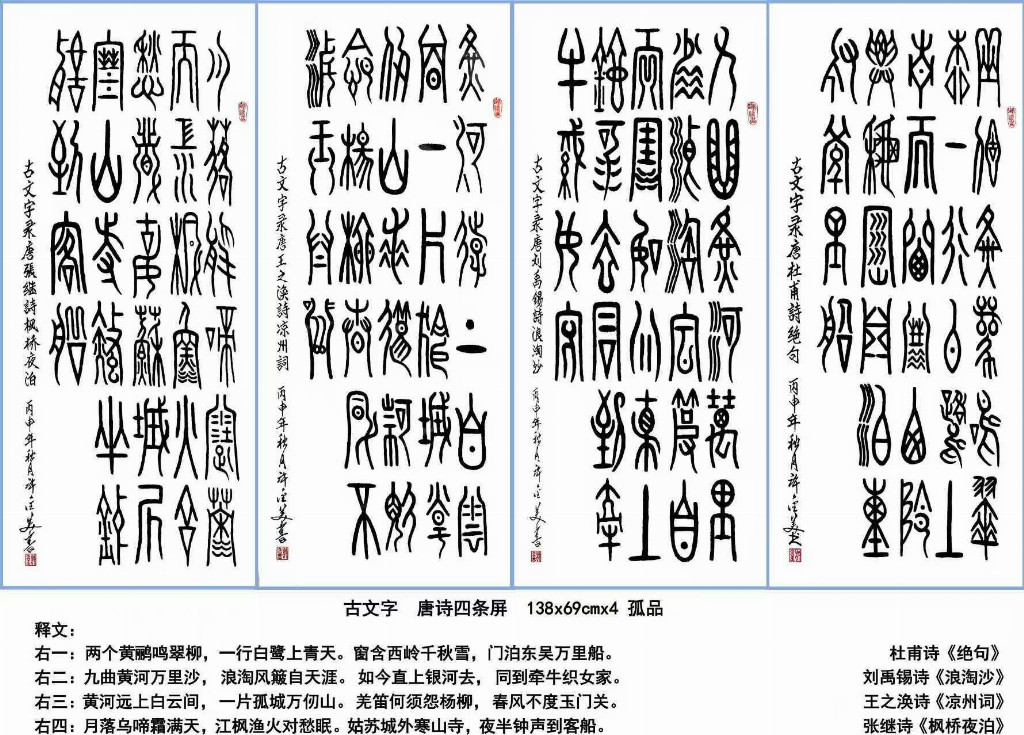 古文字 《 唐诗四条屏 》 138x69x4cm 孤品