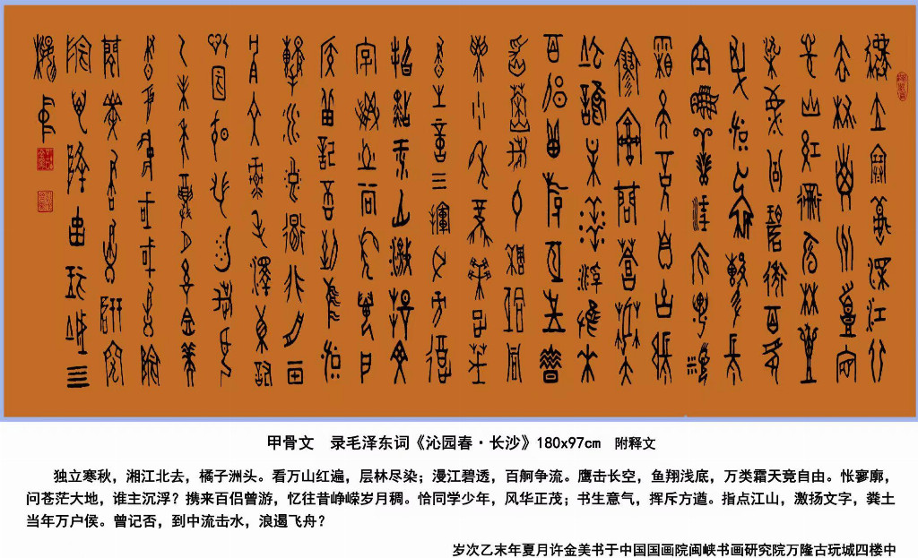 专一门为精,专多门为博通,在书画界,许金美老师便是一位博通的存在,其所写甲骨文书法作品不仅在艺术界独领风骚,更在文化传承方面具有不可替代的作用。他将传统甲骨文艺术与现代审美完美融合,创作出一系列既具有历史价值又符合现代审美的书法作品。其作品不仅在国内受到推崇,更在国际艺术舞台上获得了极高的评价。许金美老师通过其作品,成功地将中国传统文化的精髓介绍给世界,为促进中外文化交流与理解做出了卓越的贡献。他的甲骨文书法不仅为个人赢得了荣誉,也为甲骨文这一古老艺术形式在当代的传播与保护注入了新的活力。