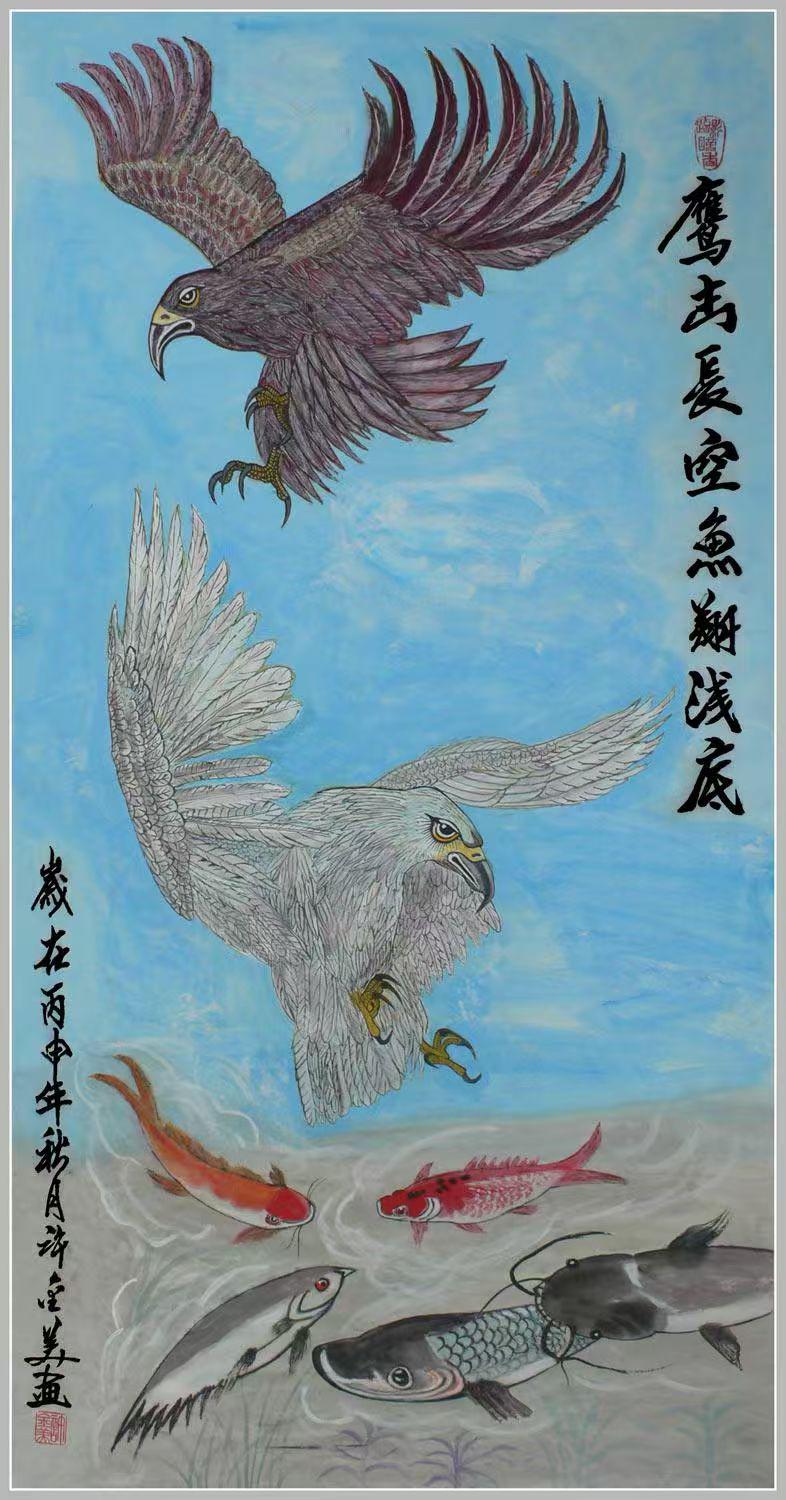 国画:鹰击长空,鱼翔浅底。138x69cm(孤品)。