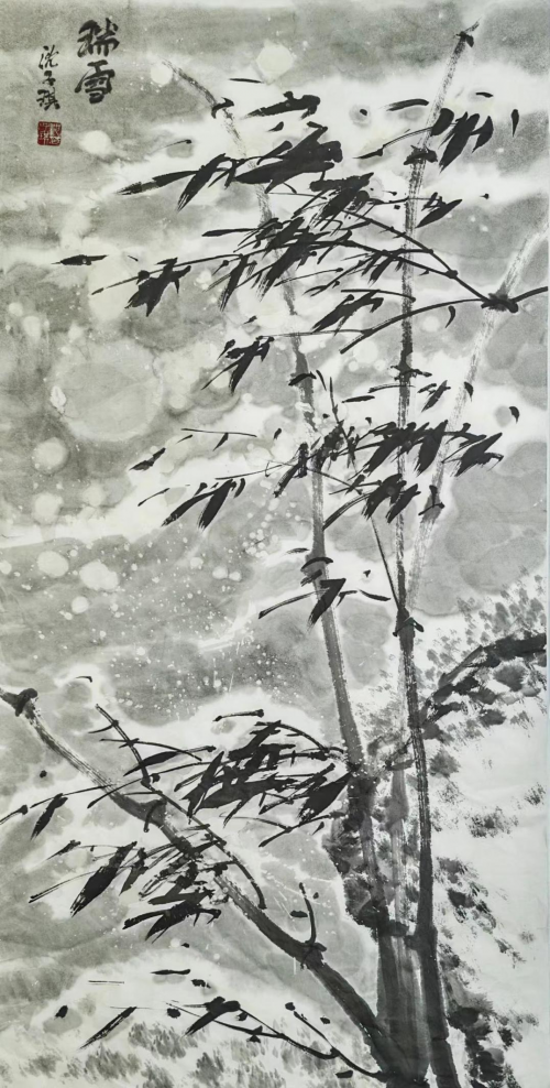 沈子琪笔下的竹子形态各异,各具神采。风中之竹,枝叶飞扬,仿佛能听见竹叶沙沙作响,感受到风的流动;雨中之竹,墨色淋漓,竹叶低垂却韧性十足,展现出不屈的生命力;晴日之竹,挺拔舒展,沐浴在光影之中,宁静而充满生机;雪中之竹,银装素裹,依然傲然挺立,彰显出不屈的品格。这些不同情境下的竹子,不仅仅是自然状态的描摹,更是艺术家内心世界的投射。