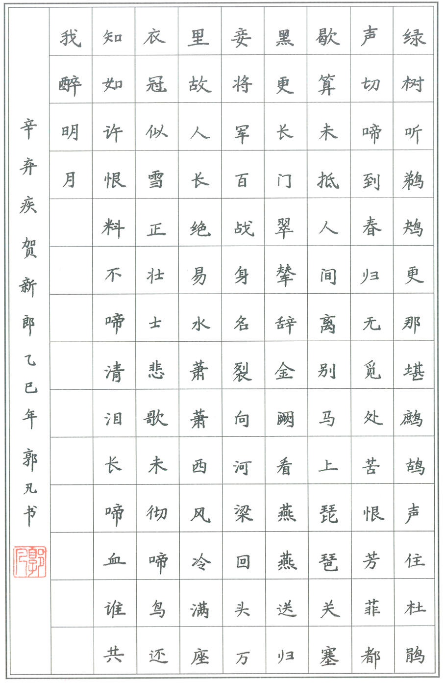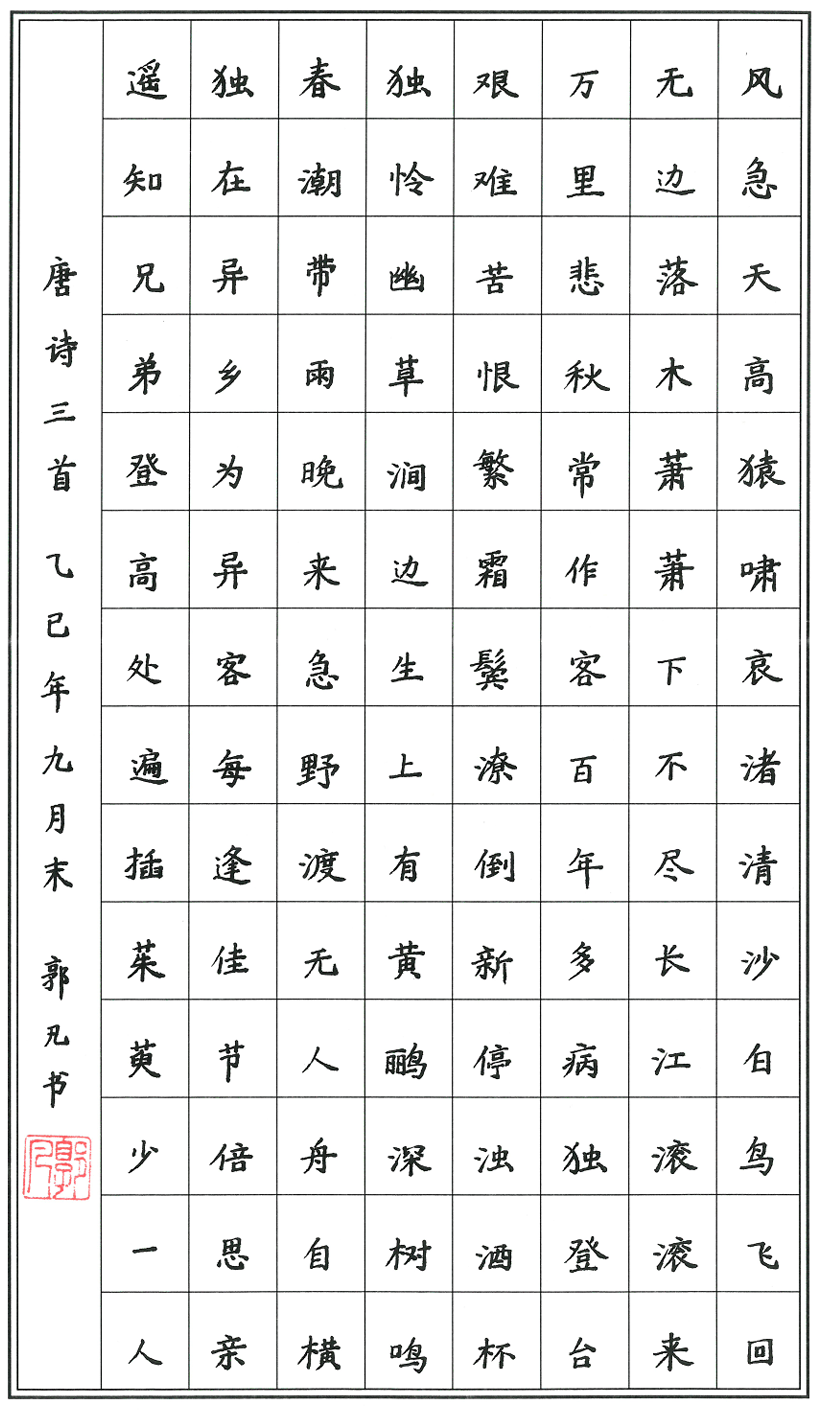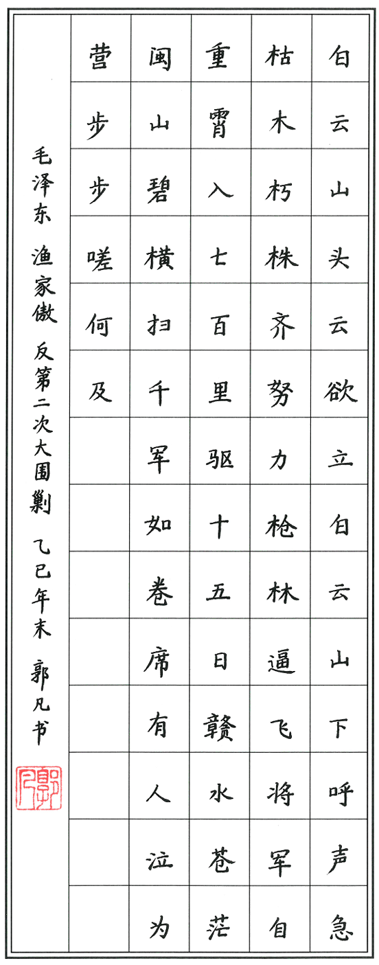 郭凡 男 64岁。香港中国书法家协会荣誉主席。2004年10月在“十月赞歌——庆祝祖国五十五华诞全国书画摄影艺术邀请赛”上获硬笔金奖。2005年在“兰花杯”第二届全国青少年书画段位大赛上获硬笔一等奖,并授予八段艺术段位。2006年入选《中华传世书画鉴赏》一书并获硬笔“传世金奖”。2009年在《中国艺术家大典》征稿评选活动中荣获硬笔书法金奖。2010年在由中国美术教育委员会和中国书画摄影家协会举办的“黄山杯第十八届中国当代书画名家作品邀请赛”上获硬笔书法金奖。2011年荣获“名家名作”中国书画家优秀作品邀请赛硬笔金奖。2011年在第十九届“母亲颂”全国书画摄影作品大赛中获硬笔金奖。2013年在第二十三届“中华杯”全国书画摄影大展中获硬笔金奖。2013年在“滕王阁杯”中国南昌第9届文学艺术大奖赛中获硬笔书法一等奖。2013年七月在“墨舞中华·第一届全国书画家作品邀请赛”中获硬笔金奖。2014年在第十二届“阳光杯”全国书画摄影大赛中获硬笔书法金奖。2015年在全国第11届“滕王阁杯”文学艺术大赛中获硬笔书法一等奖。2015年在“黄山杯”全国书画摄影大展赛中荣获金奖。2017年在“艺海杯”全国书画摄影大展赛中荣获硬笔金奖。2021年在香港中国书法家协会举办的第十五届“中国艺术家作品邀请展”评比大赛中荣获第一名。